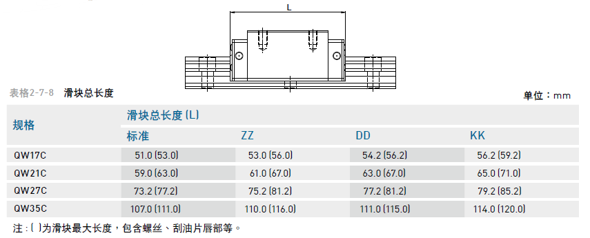 3、 防塵代碼之滑塊總長度及規格對照表,請訂直線導軌的時候一定要確認清林,以便出錯